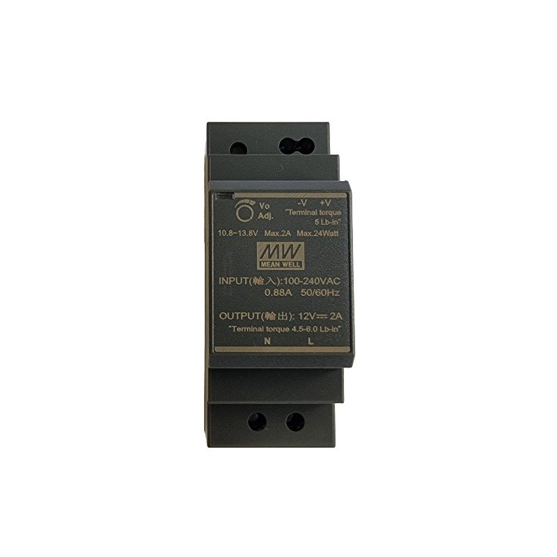 DIN šinski napajanje snage 24 W sa stabilizovanim izlazom 12 VDC i strujom do 2 A, pasivnim hlađenjem i jednim izlazom za pouzdano napajanje uređaja.