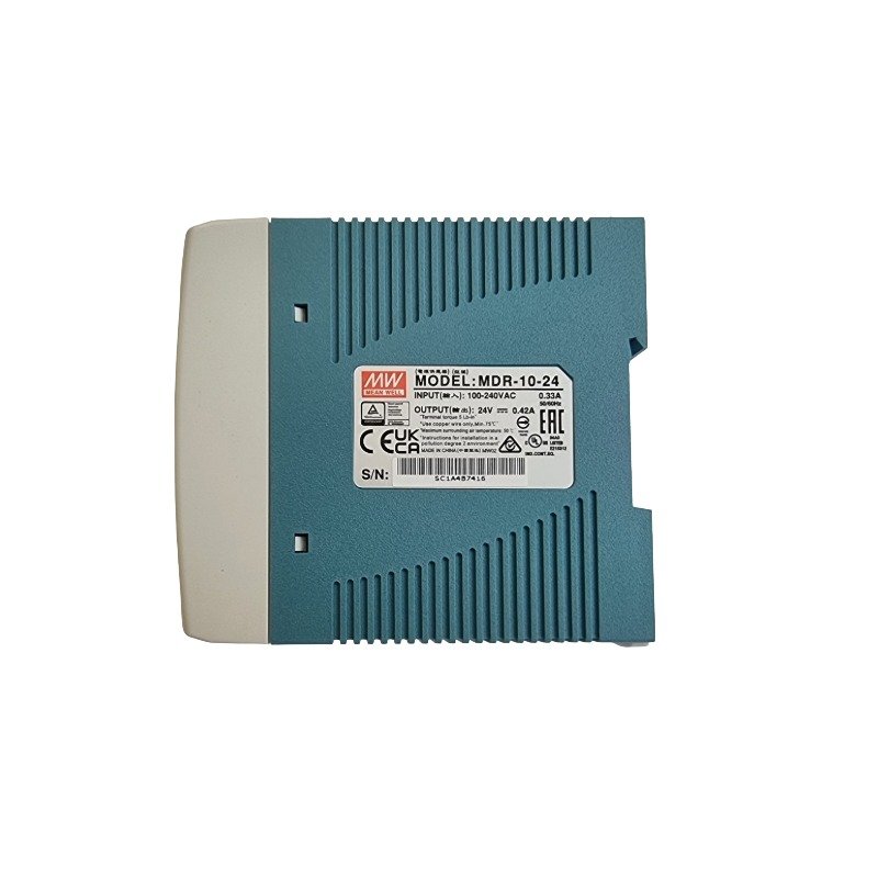 DIN šinski napajanje snage 10 W sa stabilizovanim izlazom 24 VDC i strujom do 0,42 A, pasivnim hlađenjem i jednim izlazom za pouzdano industrijsko napajanje.