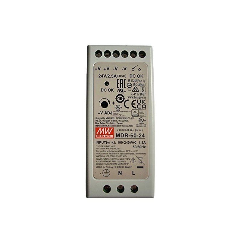 DIN šinski napajanje snage 60 W sa stabilizovanim izlazom 24 VDC i strujom do 2,5 A, pasivnim hlađenjem i jednim izlazom za pouzdano industrijsko napajanje.