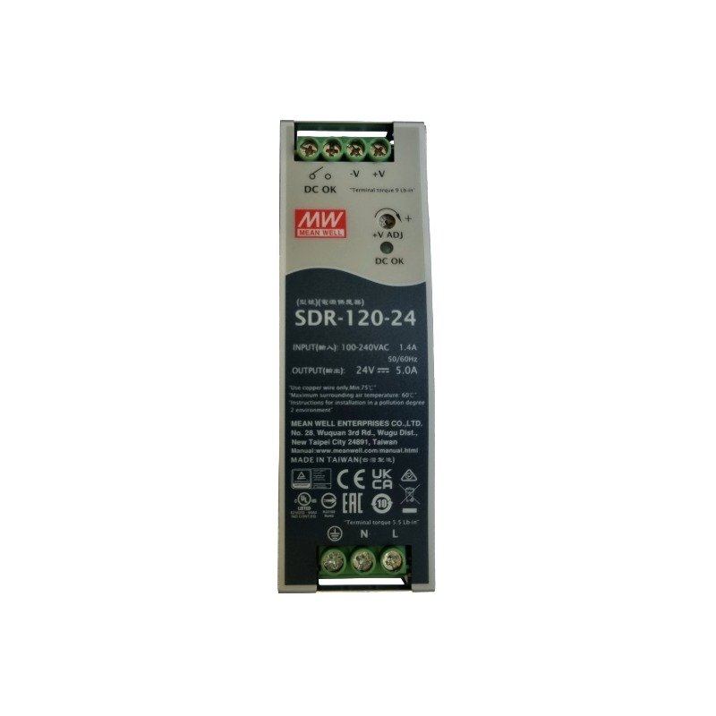 DIN šinski napajanje snage 120 W sa stabilizovanim izlazom 24 VDC i strujom do 5 A, pasivnim hlađenjem, jednim izlazom i PFC za pouzdano industrijsko napajanje.