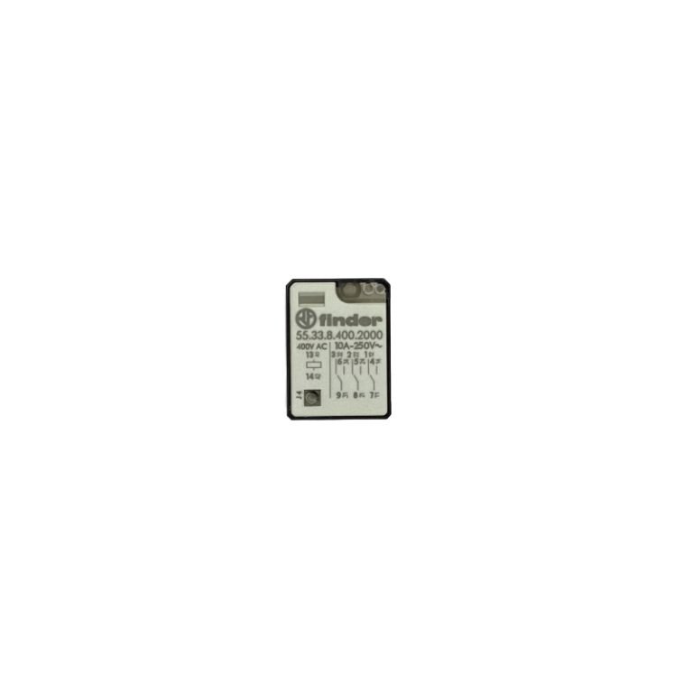 Finder 55.33.8.400.2000 je industrijski relej, plug-in verzija za ležište, 3 pola, CO (nPDT), 10 A, kontakti AgNi, AC kalem, 400 V, radni napon od 304 do 440 V, nazivna snaga 1,3 VA, otpor kalema 50000 Ω, potrošnja 3,5 mA, zadržavajući napon 320 V, minimalni napon za isklop 76 V, temperaturni opseg rada od -40 do +85 °C.