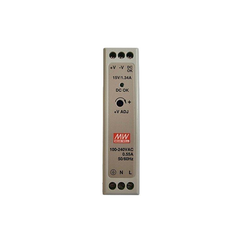 DIN šinski napajanje snage 20 W sa stabilizovanim izlazom 15 VDC i strujom do 1,34 A, pasivnim hlađenjem i jednim izlazom za pouzdano napajanje uređaja.