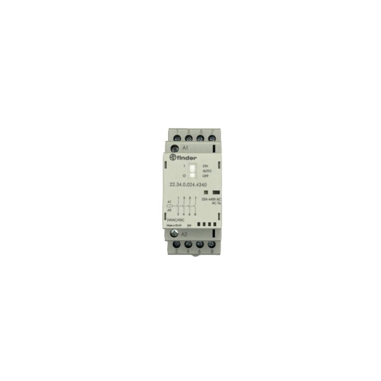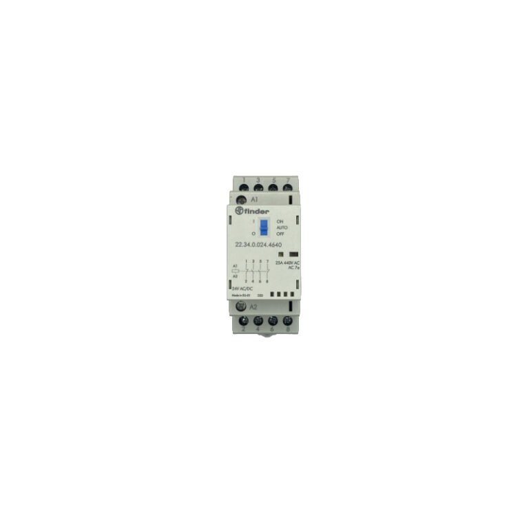 Robustan instalacioni kontaktor sa 4 prekidača, za rad na 230 V AC/DC, sa maksimalnim opterećenjem do 25 A i visokom trajnošću rada, namenjen montaži na DIN šinu.